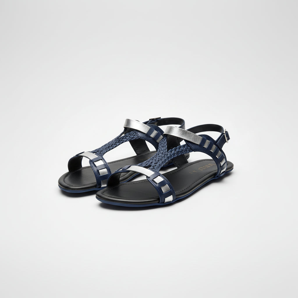 Blinq to twoje nowe sandały boso, co jest entuzjastyczne w kwestii szczegółów i najwyższego komfortu. Ciemnoniebieska gładka skóra ma efektowny dotyk przez tkane srebrne paski bez nachłaniania.