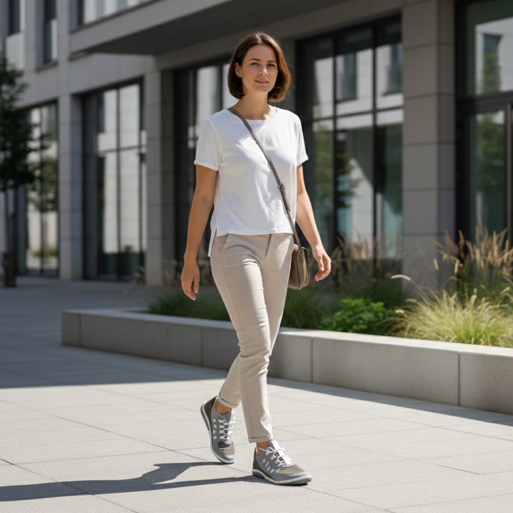 Nasz brisq ma dynamiczny wygląd poprzez cięcie. Używamy perforowanej skóry Nappa w jasnoszary wygląd i ciemnoszary zamsz. Aby dać boso butom sportową nutę, ustawiliśmy białe akcenty w obszarze koronek i po bokach.
