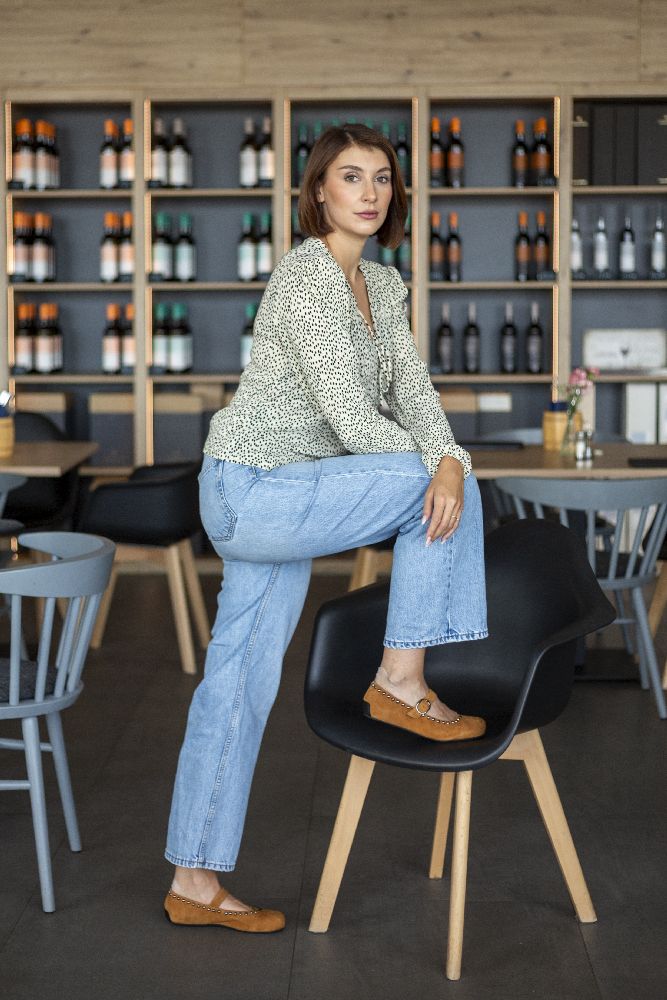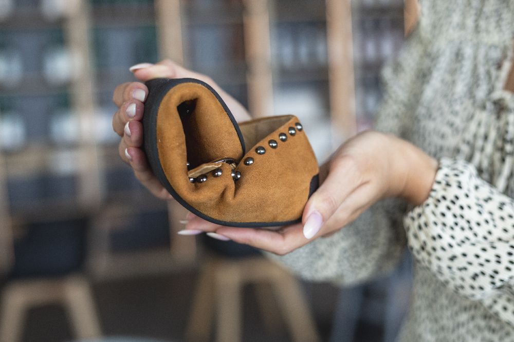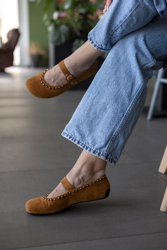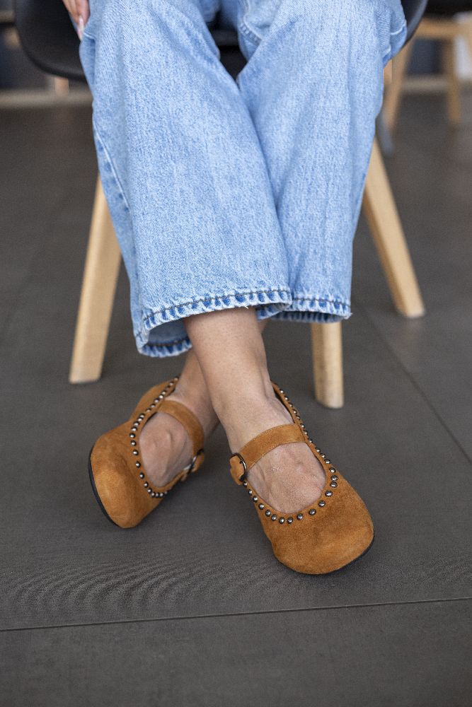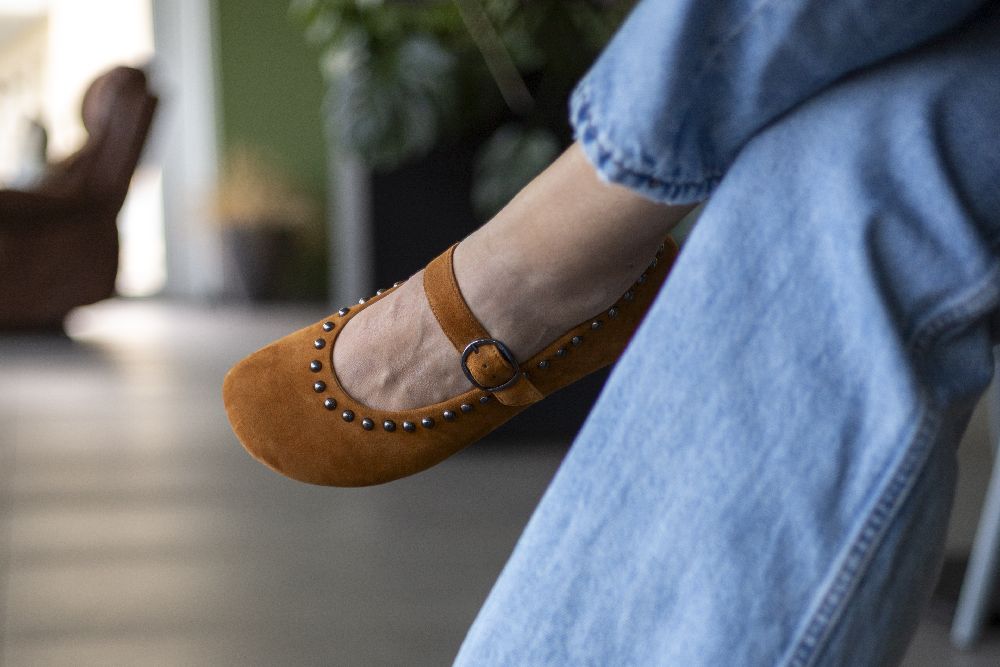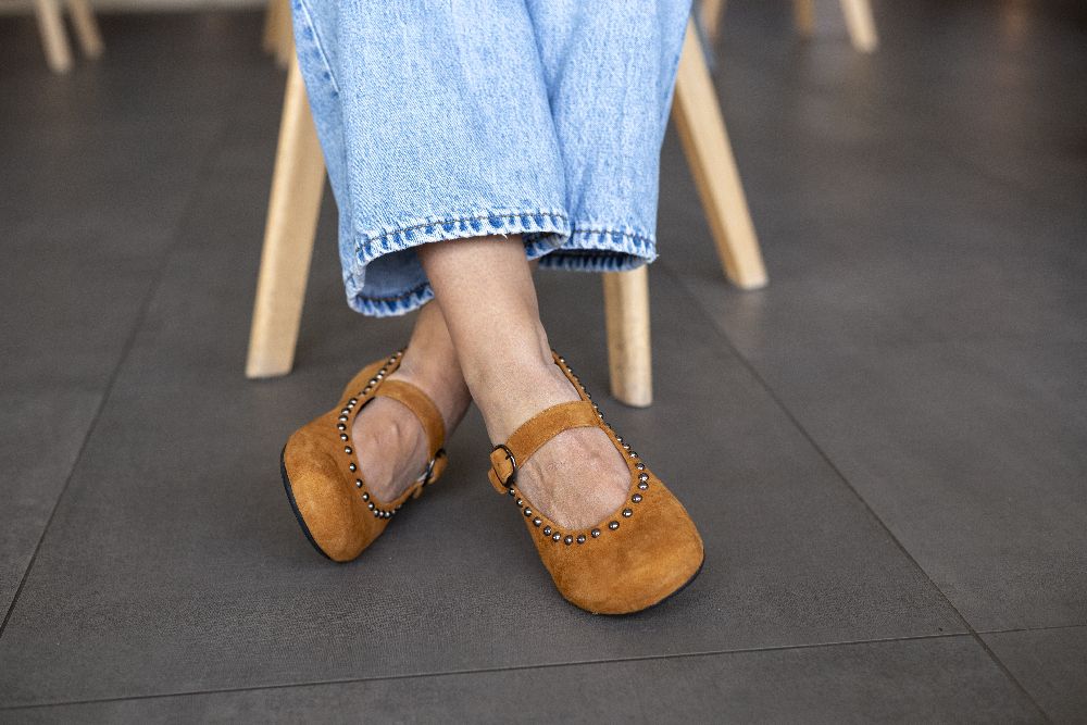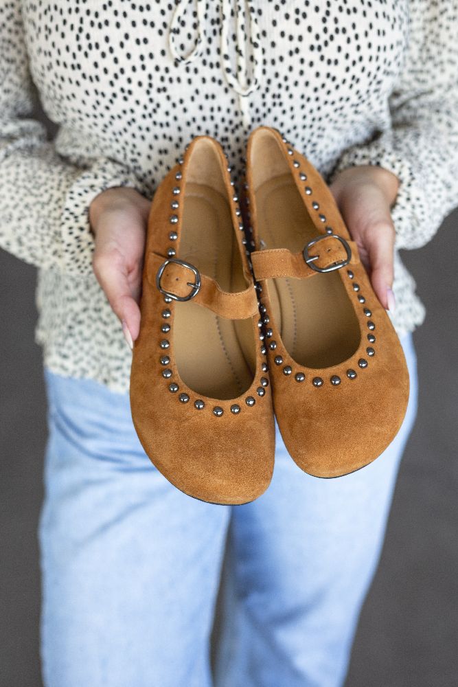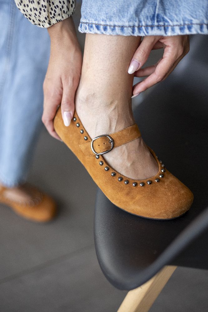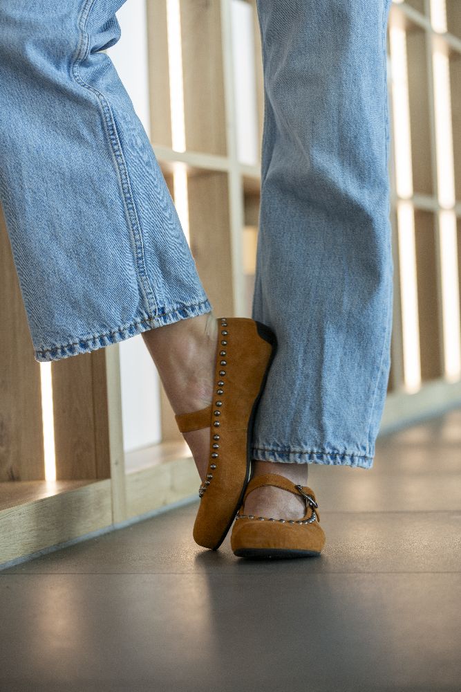 Nasz Dieqo Brown to nasz nowy but balerinowy wykonany z brązowego zamszu. Ten kawałek biżuterii jest wyłożony okrągłymi nitami i daje każdemu strojowi urok, bez rezygnacji z niesamowitego komfortu, do którego jesteś przyzwyczajony z naszych bosów.