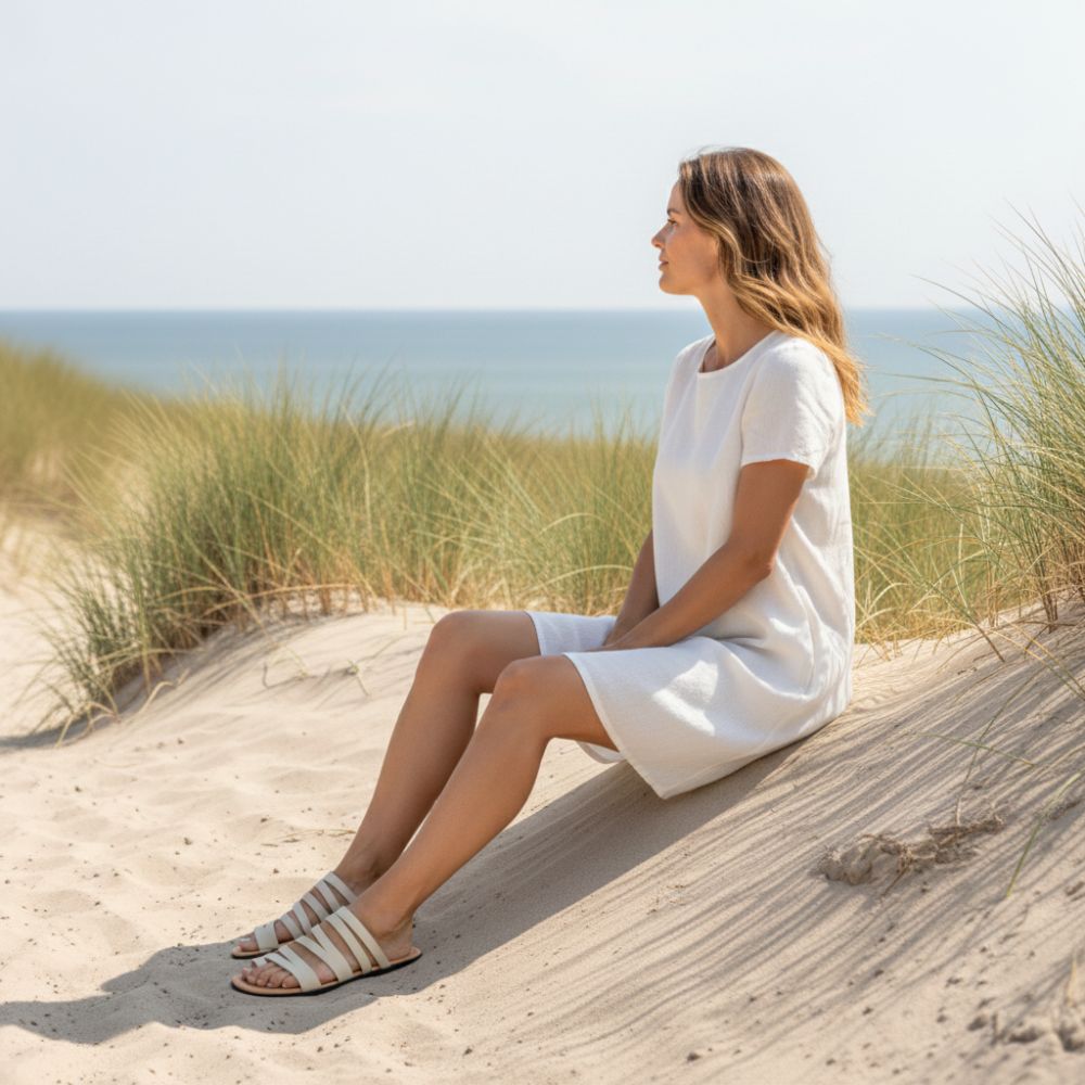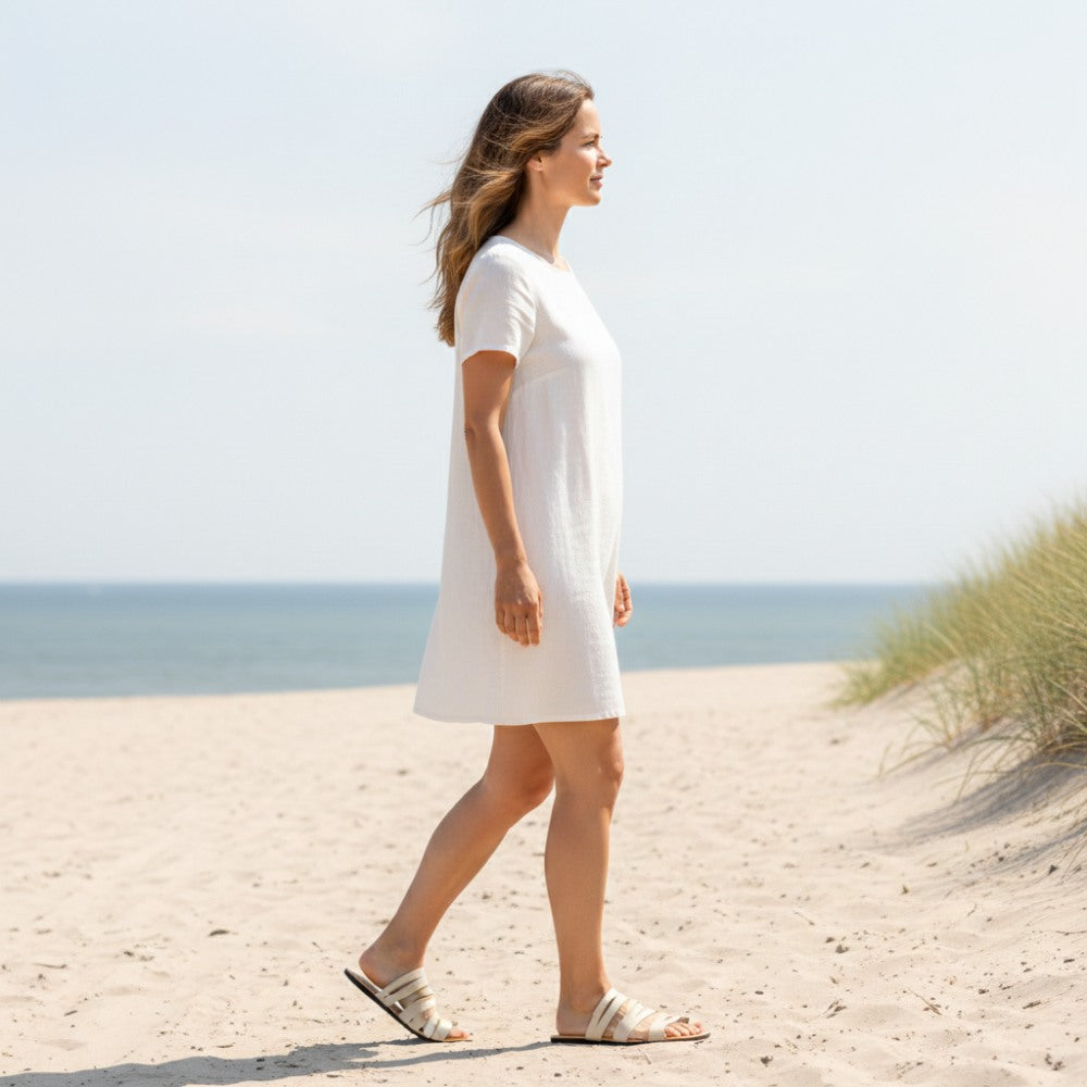 Daje ci paski wykonane z cienkiej skóry nappa. Z przodu przymocowaliśmy osobną zawieskę dla dużego palca, aby dać ci jeszcze większe wsparcie w sandałach boso. Na cienkiej i płaskiej podeszwie biegasz szczególnie delikatnie i czujesz podłogę z każdym krokiem i oczywiście możesz toczyć stopę.