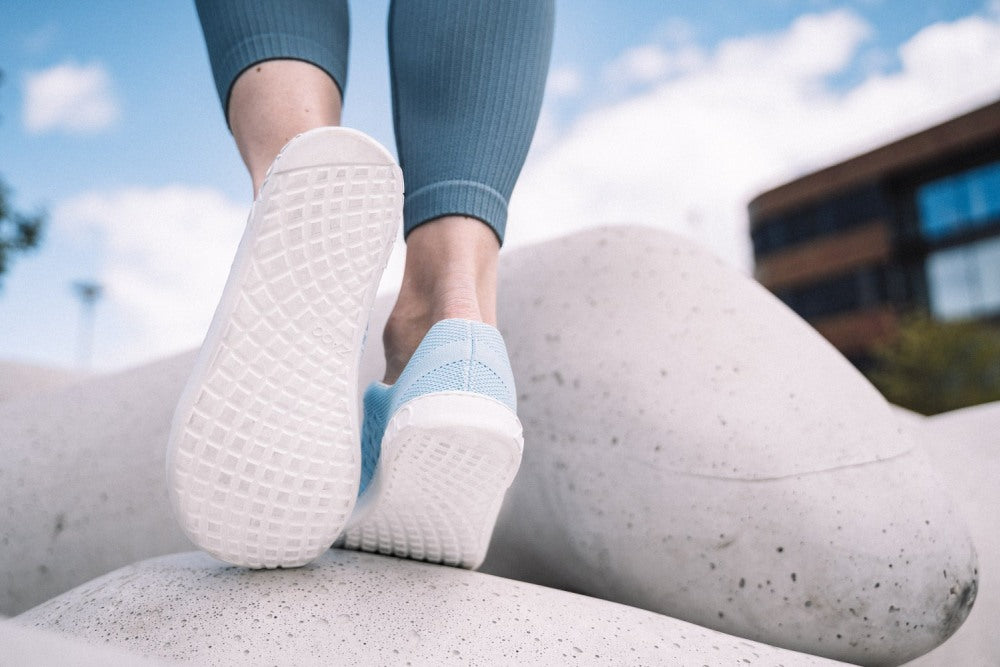 Gumowa podeszwa z zerową piętą, w ten sposób zmniejszając kręgosłup i chroniąc stawy, wspiera naturalną postawę