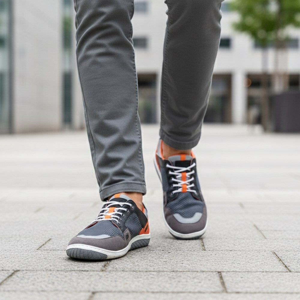 - Gumowa podeszwa zewnętrzna z zerową piętą, w ten sposób zmniejszając kręgosłup i chroniąc stawy, wspiera naturalną postawę