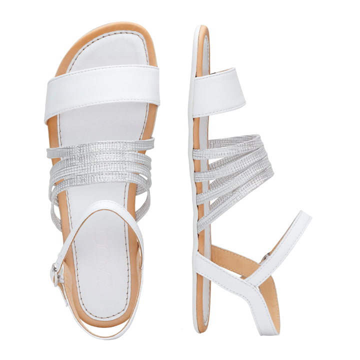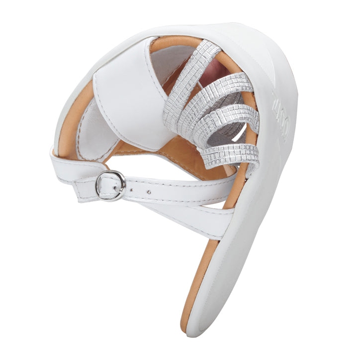 Qassidy to twoje nowe sandały boso, które są jednocześnie subtelne i efektowne. Połączenie białej gładkiej skóry i srebrnego paska wzoru wygląda elegancko i szczególnie kobiece.