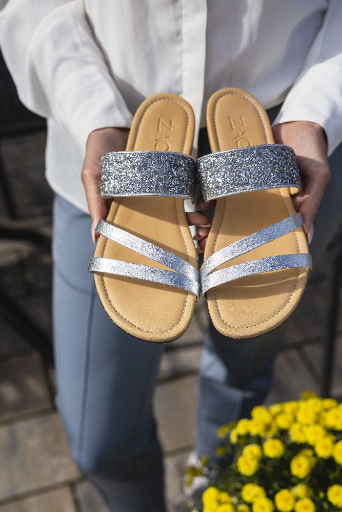 Z błyszczącym srebrnym wykończeniem te sandały boso łapią światło i ustawiają efektowny akcent na każdym kroku. Projekt jest zarówno elegancki, jak i praktyczny, z dwoma delikatnymi paskami z przodu i szerszym paskiem powyżej napięcia, który nie tylko przemawia do wizualnie, ale także zapewnia optymalne wstrzymanie.