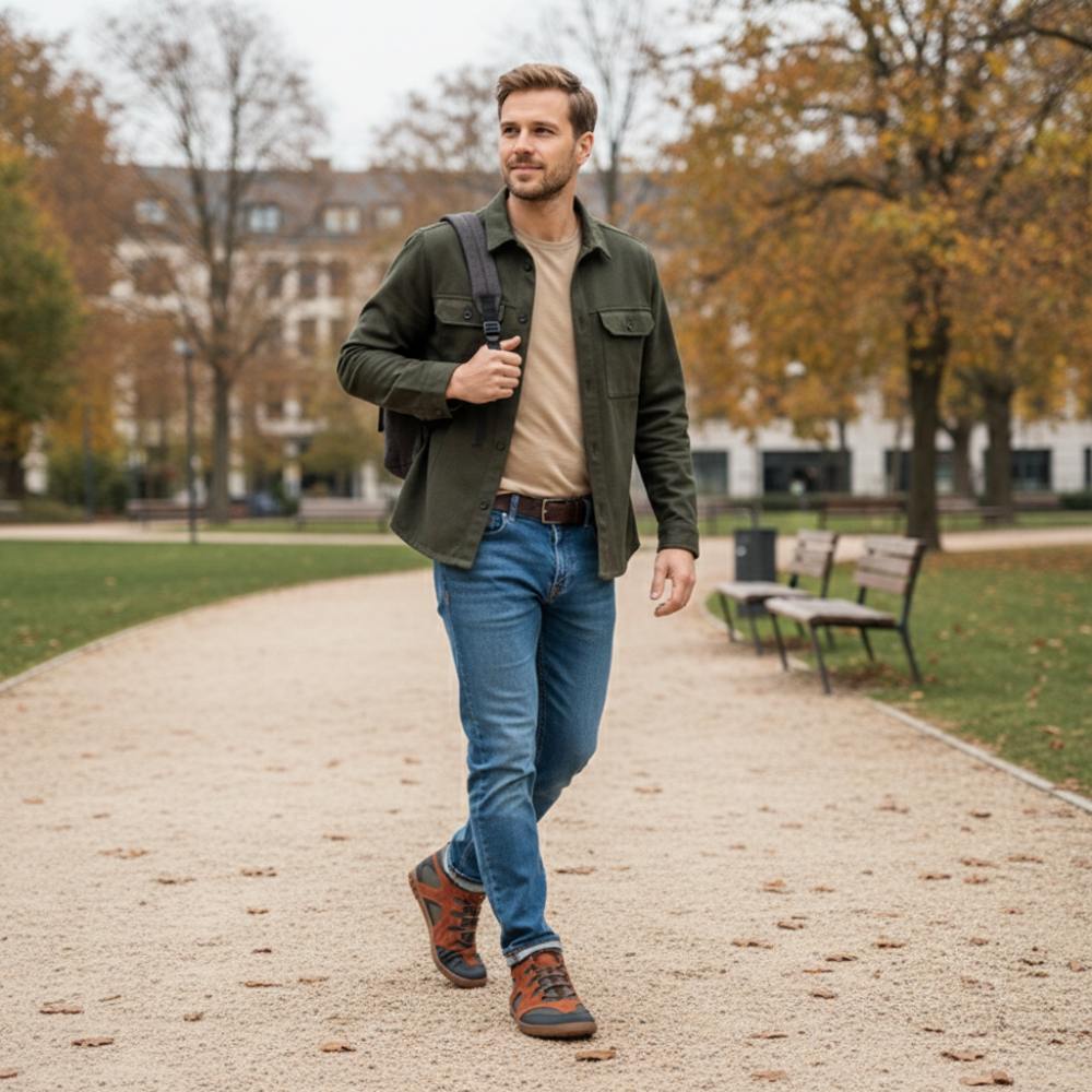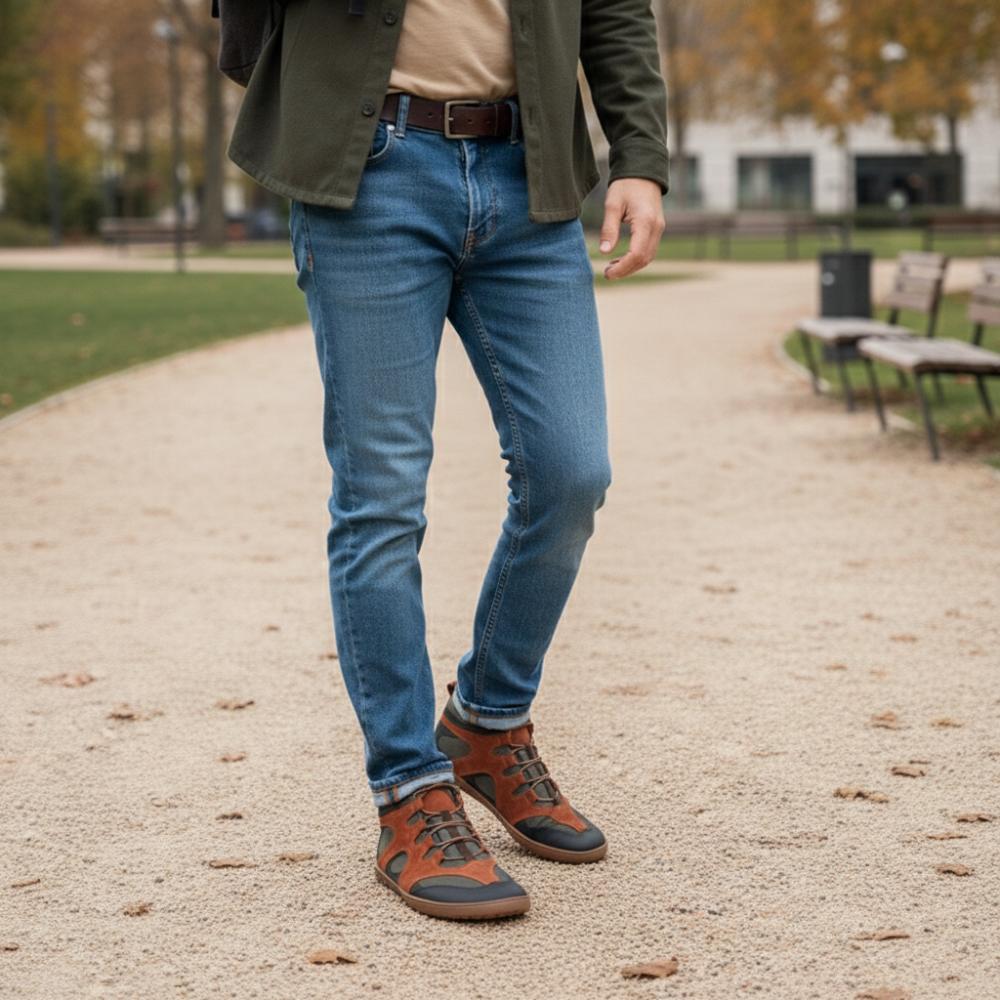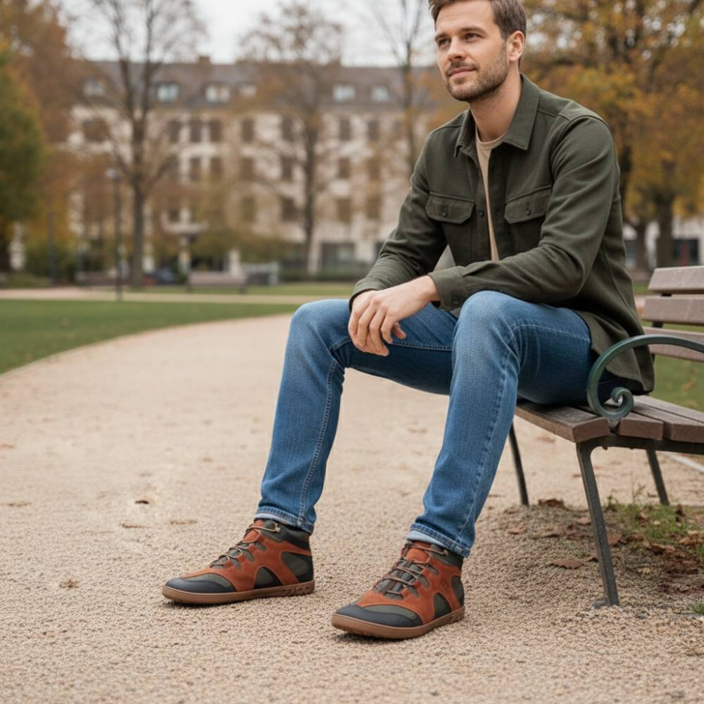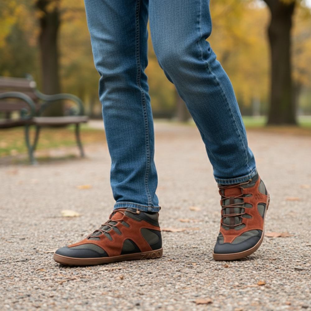 Gumowa podeszwa z zerową piętą, w ten sposób zmniejszając kręgosłup i chroniąc stawy, wspiera naturalną postawę