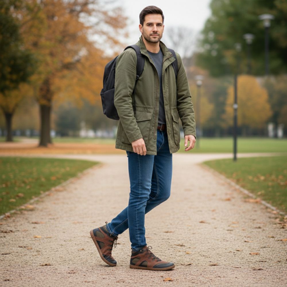 - Gumowa podeszwa z zerową piętą, w ten sposób zmniejszając kręgosłup i chroniąc stawy, wspiera naturalną postawę