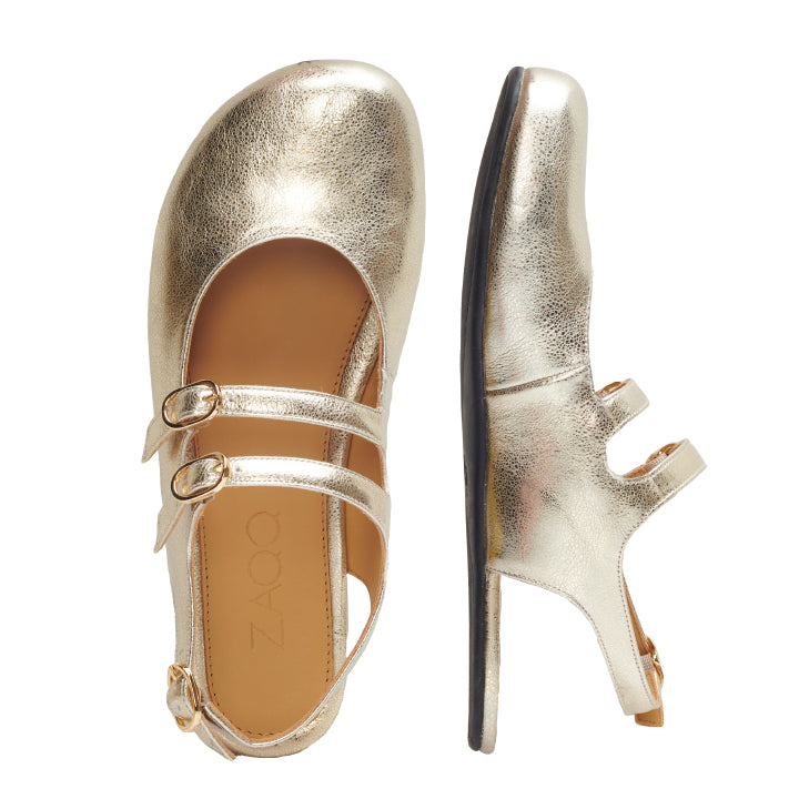 Nasza Qomeet Gold łączy urok i komfort w otwartym bucie baleriny. Z regulowanymi paskami nad zaciskiem i dodatkowym paskiem z tyłu, nasz Qomeet Gold oferuje idealne dopasowanie i bezpieczny trzymanie na każdym kroku.