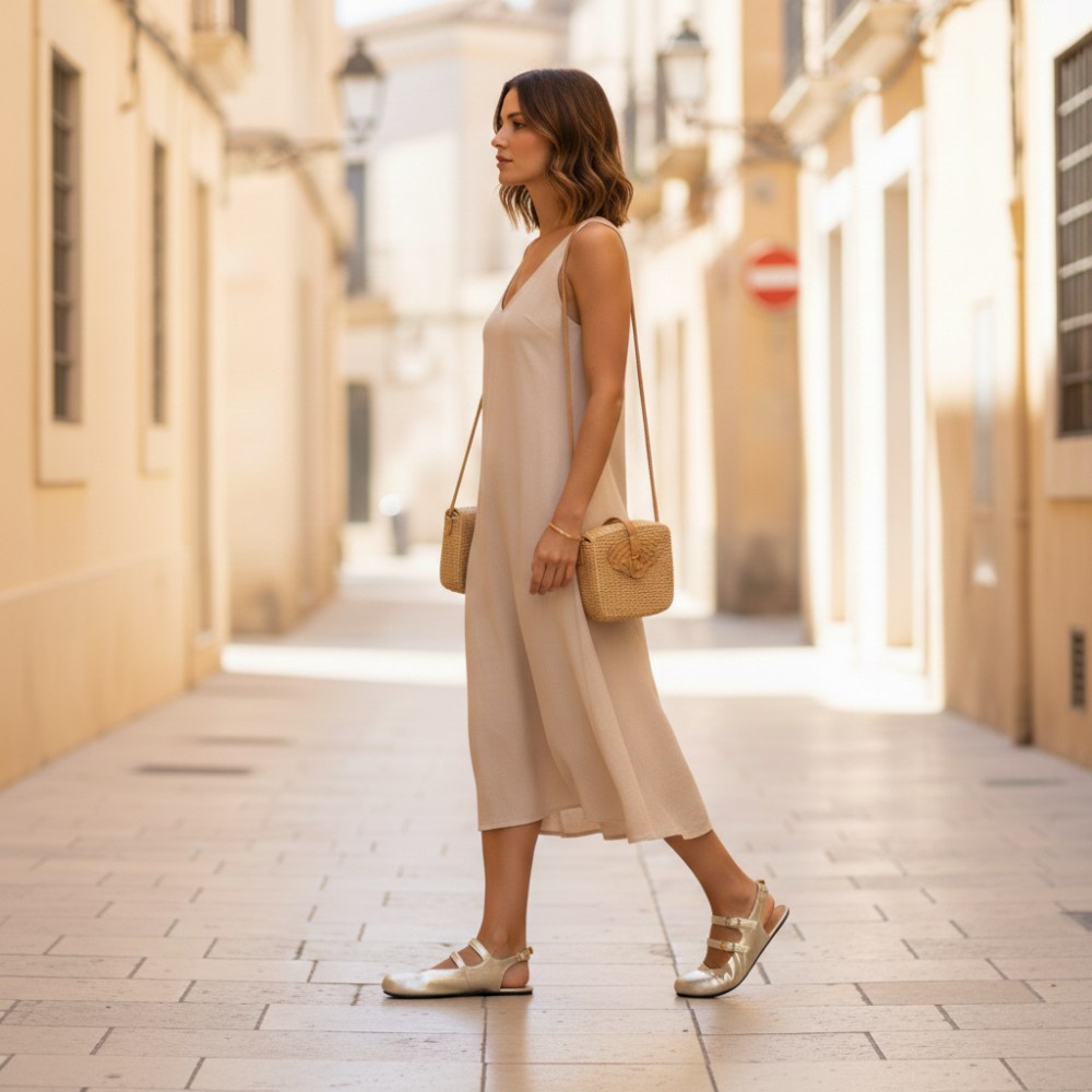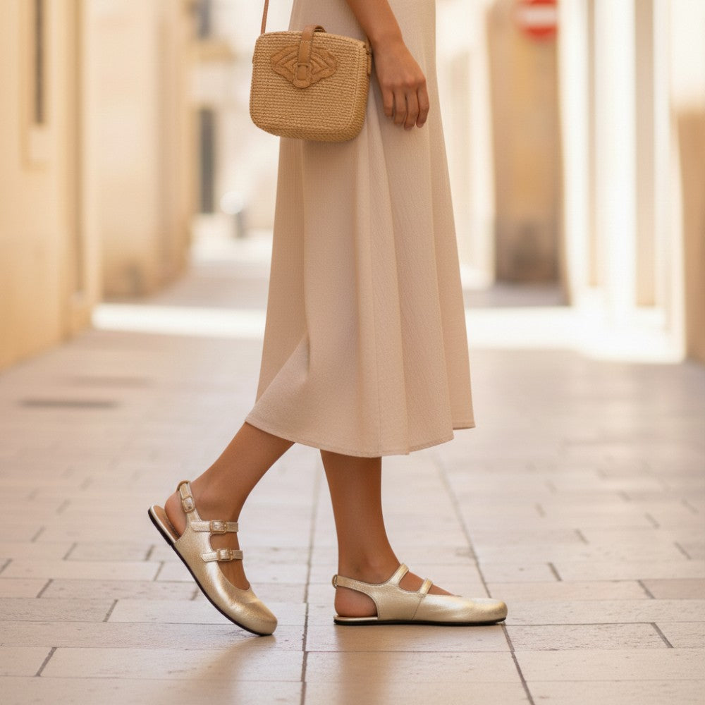Elastyczna podeszwa i miękka połysk skóra dostosowują się do twoich ruchów. Bądź aktywny przez cały dzień bez powyższego stylu - nasze złoto Qomeet umożliwia to. Noś go do ulubionej letniej sukienki lub połącz z płynnymi spodniami i eleganckim topem, aby uzyskać elegancki wieczorny wygląd. Qomeet Gold nadaje Twojemu strojowi odrobinę uroku jeansom i prostej koszulce. Jest to idealny towarzysz na wesela, imprezy ogrodowe lub po prostu na jeden dzień w biurze, jeśli chcesz nadać wyglądowi specjalny akcent.