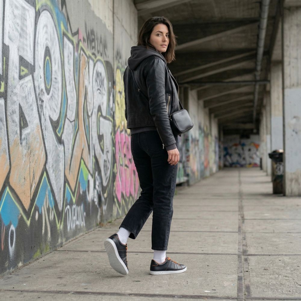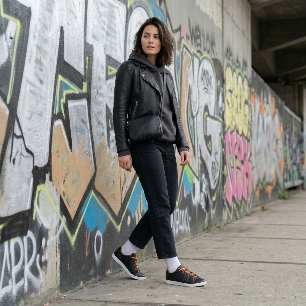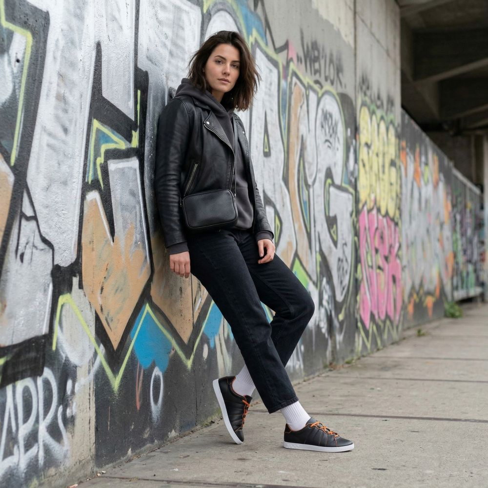 W kilku miejscach pozwalamy uderzyć, pomarańczową wewnętrzną podszewkę i tworzymy interesujące kontrasty. Ze względu na złamaną gumową podeszwę boso boso wygląda jeszcze bardziej nowocześnie.