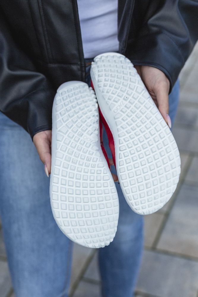 Gumowa podeszwa z zerową piętą, w ten sposób zmniejszając kręgosłup i chroniąc stawy, wspiera naturalną postawę