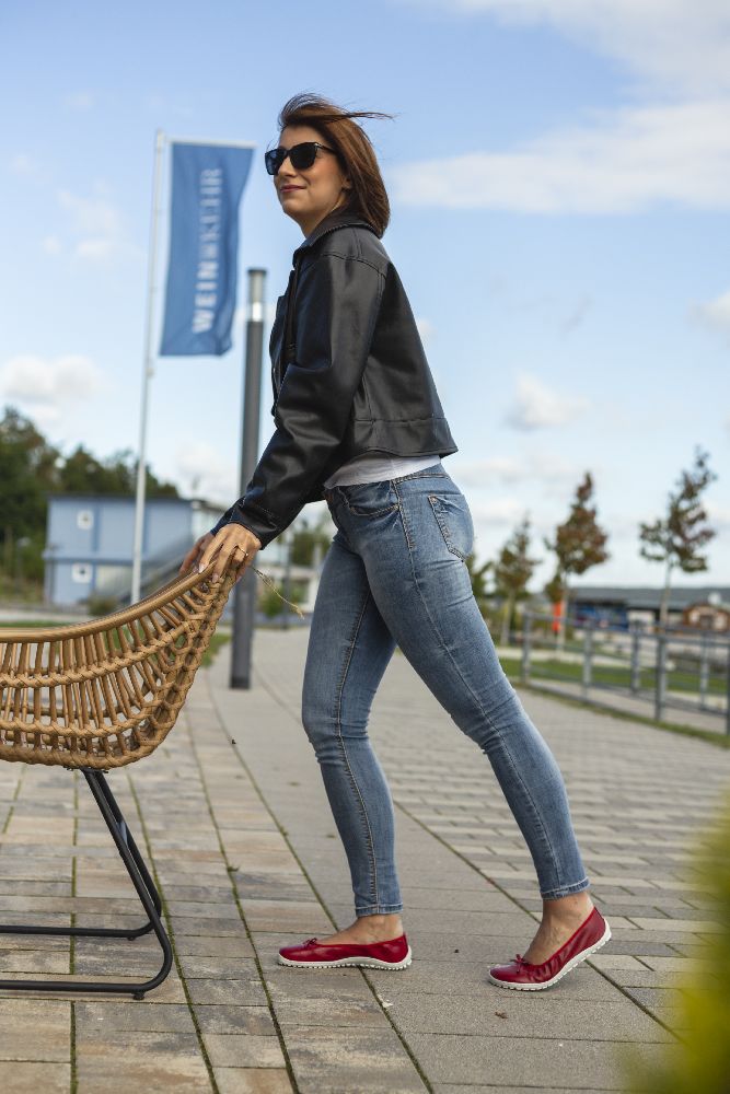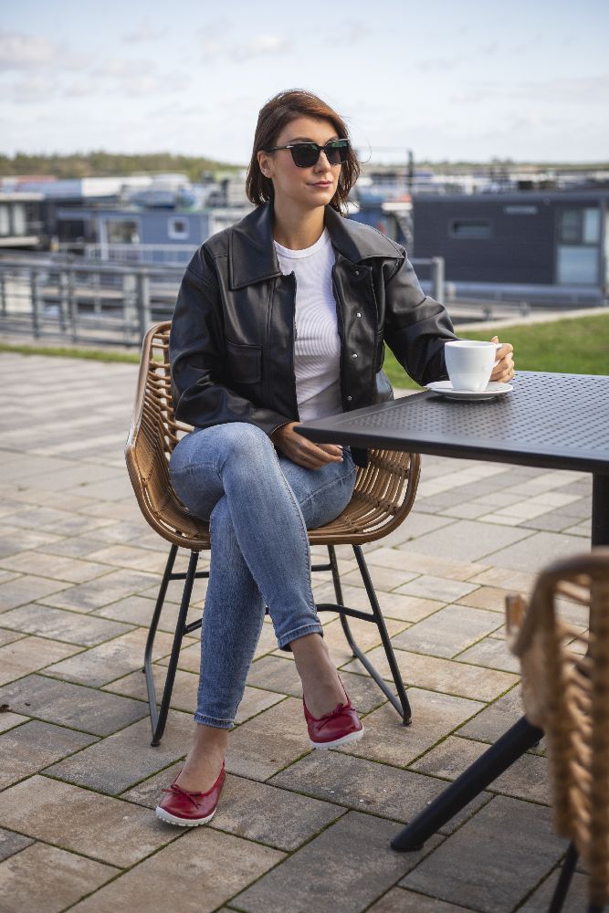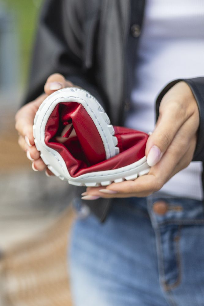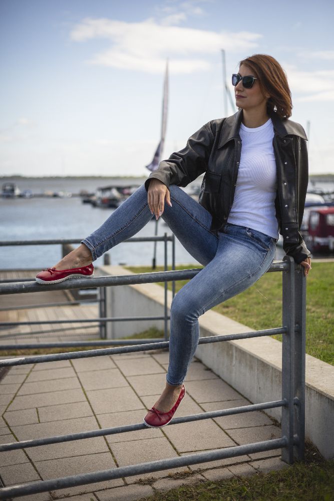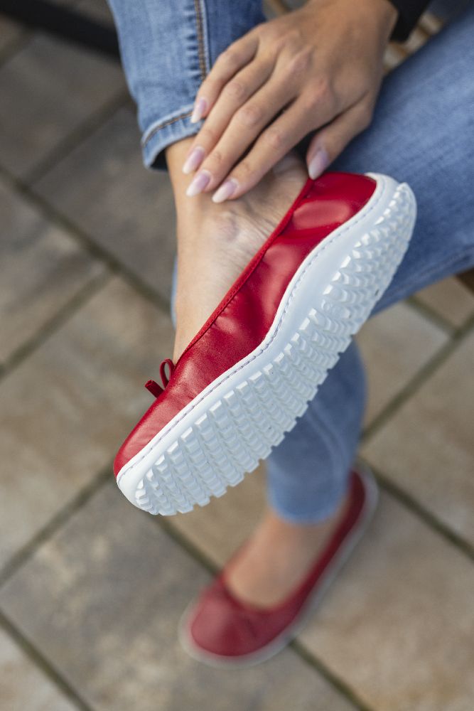Drobna, ciemnoczerwona gładka skóra i subtelna pętla nadają baletce delikatny, kobiecy wygląd. Przez złamaną sneaker podeszwa wygląda sportowo, świeży i nowoczesny. Podeszwa boso zapewnia również dobry przyczepność, a jednocześnie jest tak cienka i elastyczna, że twoje stopy odczuwają podłogę na każdym kroku.