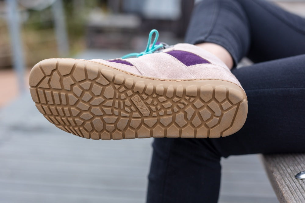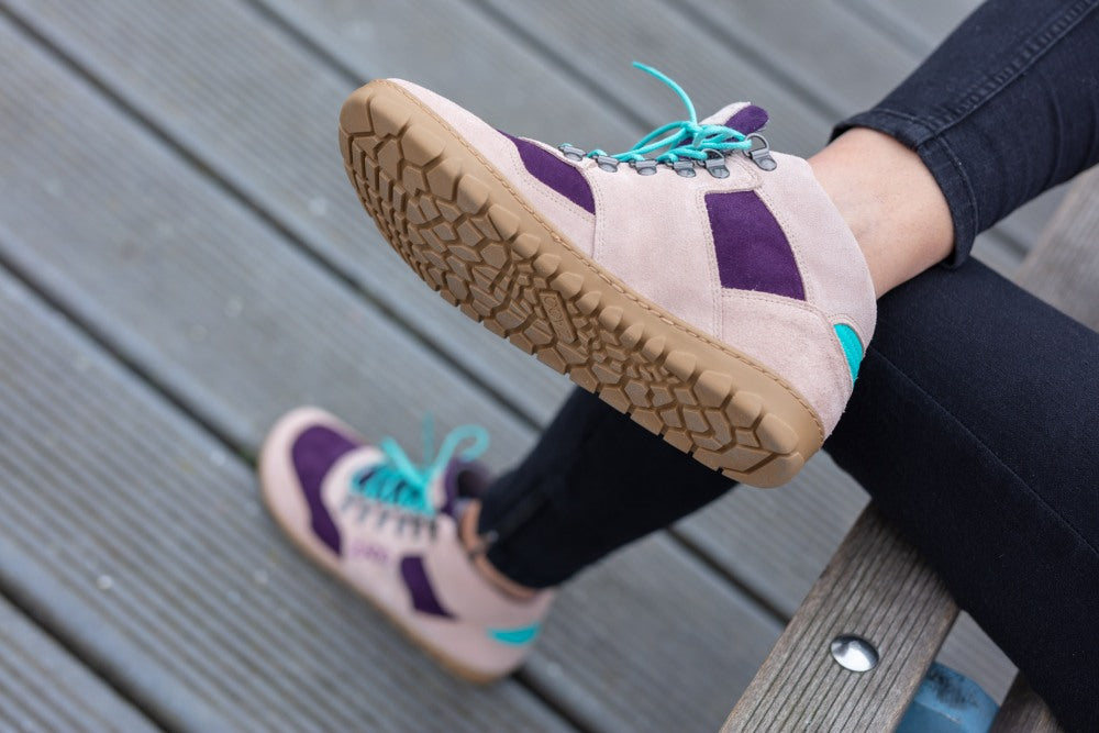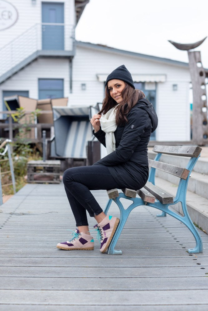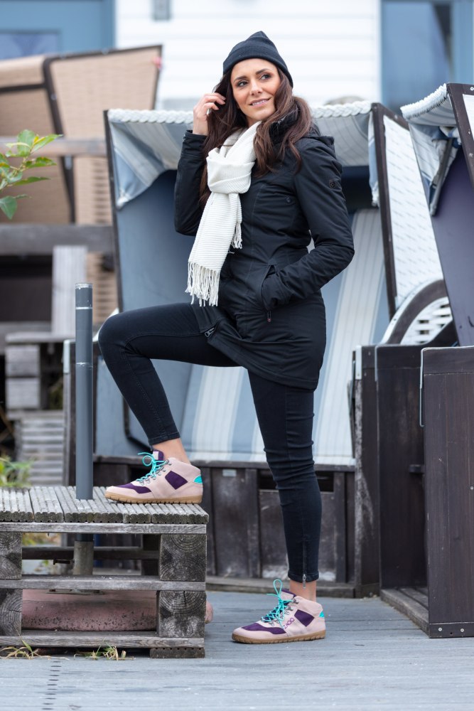 Znaczna część jest wykonana z zamszu wysokiej jakości w kombinacji delikatnej nagiej i fioletowej. Turkusowe szczegóły z tyłu i koronki w tym samym kolorze stanowią ładny kontrast. ZAQQ Membrana, która jest wiatrem, wodoodporna i oddychająca.